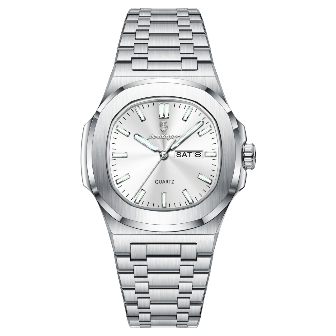 Spectre incarne la précision et la modernité. Son mouvement quartz assure une fiabilité sans faille, tandis que son boîtier en acier inoxydable de 40 mm et son bracelet robuste de 23,5 cm soulignent son caractère affirmé. Étanche jusqu’à 3 ATM et doté d’un affichage date et semaine, ce garde-temps allie performance et raffinement pour accompagner chaque moment avec assurance.